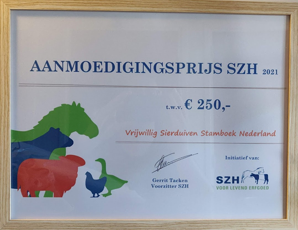 Het SZH is sinds het begin betrokken bij het VRIJWILLIG SIERDUIVEN STAMBOEK NL (VSSNL). Ter ondersteuning van het initiatief (dat kostenloos is voor de gebruikers) is de Aanmoedigingsprijs naast een eervol blijk van erkenning ook een zeer welkom financieel steuntje in de rug. Quido Valent mocht deze prijs namens het VSSNL ontvangen op “De dag van de watervogel” (zie ook: https://szh.nl/artikelen/evenementen/dag-van-de-watervogel).